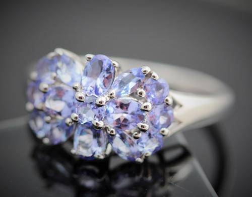 Loved for its blue, violet and purple hues, tanzanite is a precious gemstone that is hugely popular all over the globe. This impressive ring is fashioned out of sterling silver with a flower shaped ring head crafted out of tanzanite gemstone "petals". There are 15 x claw-set tanzanites - 7 x round cut, 4 x oval cut and 4 x marquise cut. Together they total 0,51 carats. The entire design is distinctly art deco, with the elongated flower shape head stretching 10mm up the finger, and 15mm across. The gemstones have beautiful varying shades of pale purple and mauve/blue colours that shine brightly when catching the light. The shank of the ring is simple and elegant, and widens as it reaches the ring head, opening up to two triangle patterns crafted into the shoulders. The ring head presents itself 5mm high above the finger. A delightful, eye-catching and pretty ring!