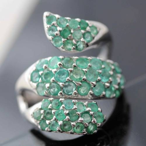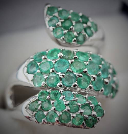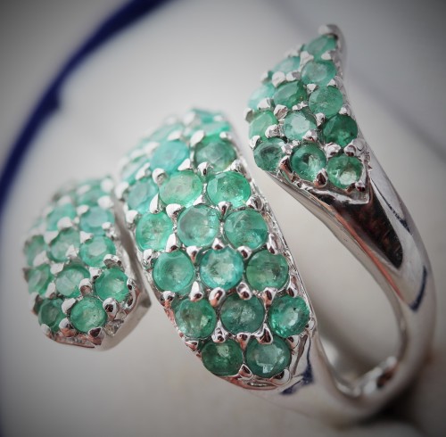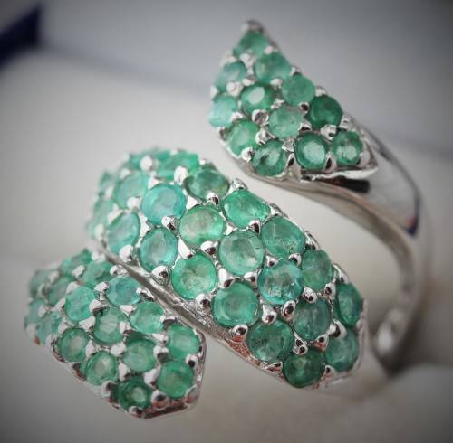 Here's something a little different to your classic ring head style. This ring features 50 beautiful natural claw-set emeralds that have been set into a 3 strand ribbon design. They total just under a full carat (0,98 carats to be precise). They are all natural Brazilian mined untreated gemstones with interesting inclusions, all jeweller tested and authenticated. The colour is gorgeous - the ring positively glows! The ring is heavy (8,31 grams) and long (21 mm up the finger x 20mm across). However, it lies fairly flat on the finger, creating a snug fit that doesn't flop around. A beautiful piece of natural beauty that creates a real conversation piece of jewellery.
