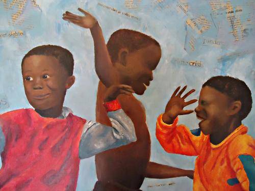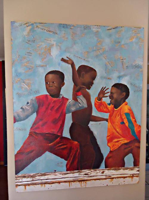 56X71 CM HAPPY PLAYING CHILDREN WITH BACKGROUND OF NEWSPAPERCUTTINGS WITH NOWADAYS PROBLEMS; THIS PAINTING TELLS A NICE STORY: DESPITE WORLDS PROBLEMS
