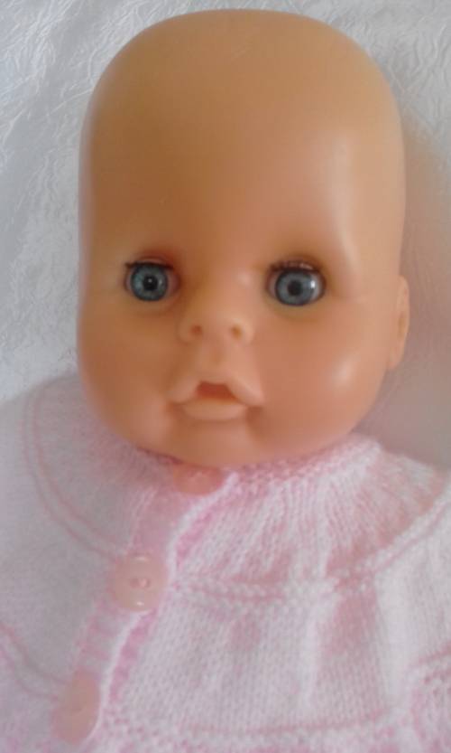 Very pretty and large (60cm) baby doll. She is clean and well dressed. Her cotton body had some stitching done. A little paintloss om her eyelids (scratches from opening and closing).