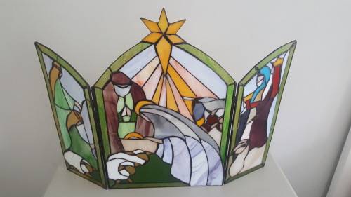 VINTAGE LARGE CHRISTMAS LEAD STAINED GLASS NATIVITY SCENE. HAS A FEW CRACKS BUT IN OVERALL GOOD CONDITION. BEAUTIFUL PIECE, OPENS AND CLOSES PERFECTLY.