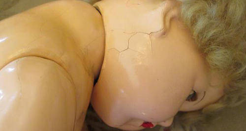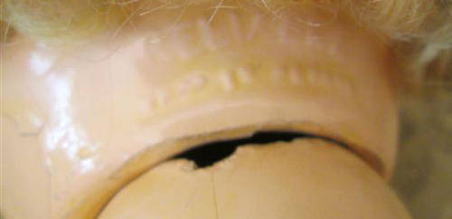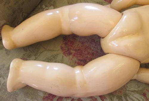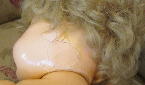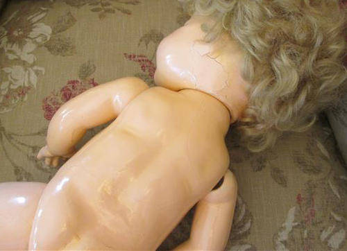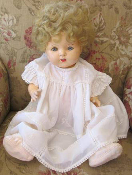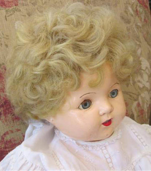 THIS IS A LARGE AND HEAVY VINTAGE, RELIABLE CANADA COMPOSITION DOLL WHO LOOKS AS THOUGH SHE COULD BE RELATED TO SHIRLEY TEMPLE. SHE HAS A FULL HEAD OF CURLY BLONDE HAIR, OPEN / SHUT EYES WITH MISSING EYELASHES, CRAZING BEHIND BOTH EARS AND MINOR CRAZING TO HER BODY AND AN OPEN MOUTH SHOWING TWO TEETH. SHE DOES NEED TO BE RESTRUNG, AN EASY THING TO DO...THIS IS A LOVELY DOLL FOR YOUR COLLECTION, HEIGHT 54.5cm.
