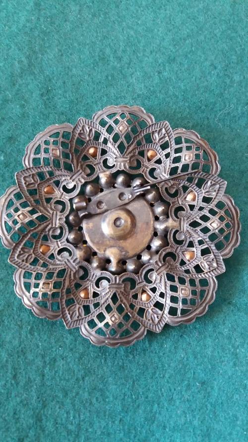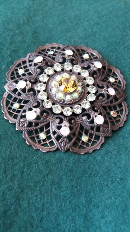 Up for auction is a lovely large vintage brooch in excellent condition. It measures approx 6cm in diameter. The stones are all intact. Please note payment to be made by Monday after close of auction. Thanks for looking