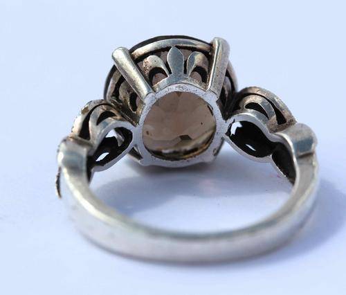 This is a lovely genuine piece from vintage years! The central stone is a smokey topaz 13 mm in diameter. There is a twisty design running down each shoulder that features real marcasites - all of them in excellent condition. It is a very large ring without being one of those knuckle-busters! I like the weight of this ring. It is over 7 grams.
