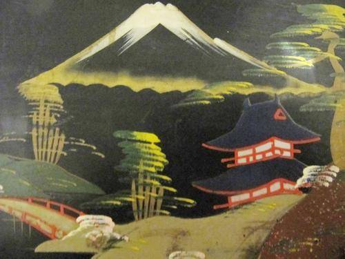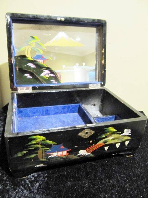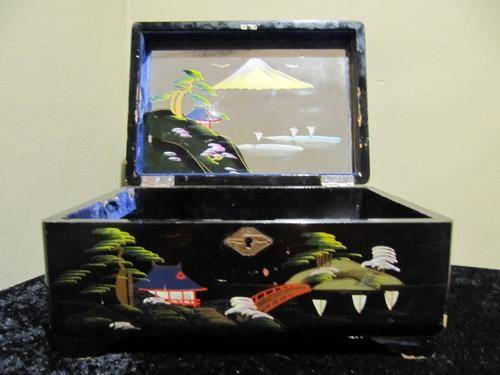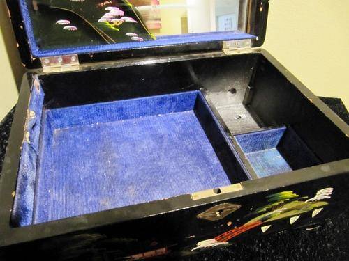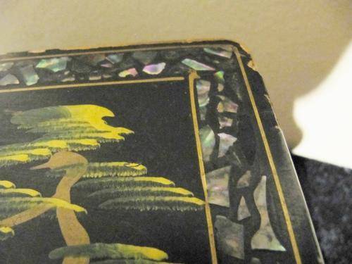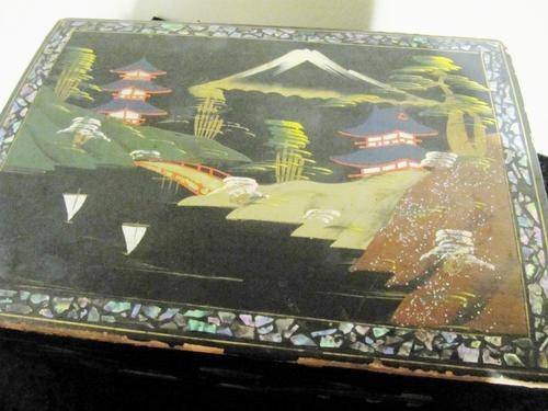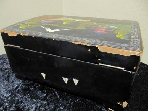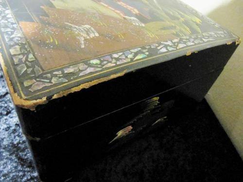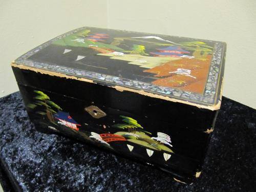 A large vintage oriental trinket box, made with a black lacquer base and enamel painting, also with shell mosaic inserts throughout. It has been well-loved and needs some tlc - see photos for details and condition.