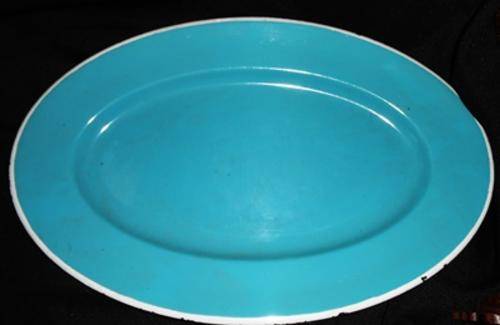This platter is heavy, not like modern enamelware. It has no damage apart from small chips around the edge.Size length 43 cm width 28 cm . A nice find for a vintage/retro look.