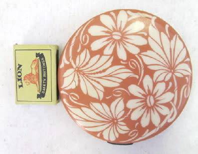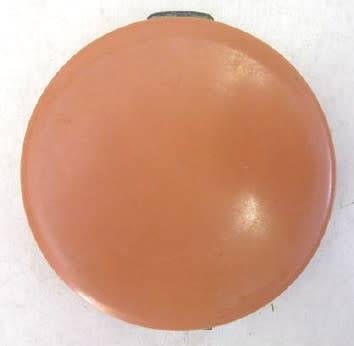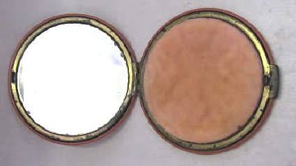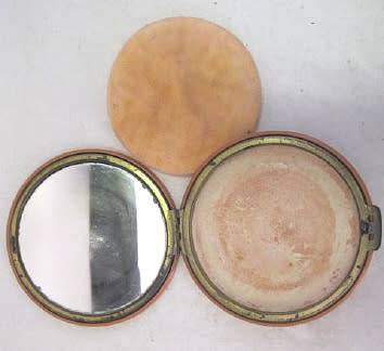 The compact has a partly metal interior and a non-metal exterior, and contains its original powder puff. It is obviously very well used but there are no major defects. The mirror is slightly cloudy, the brass-like metal parts show obvious signs of wear, and there is a very small incision on the exterior. The open/close clip is firm. Diameter 117 mm.