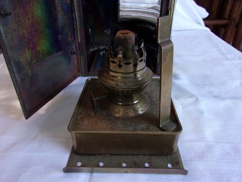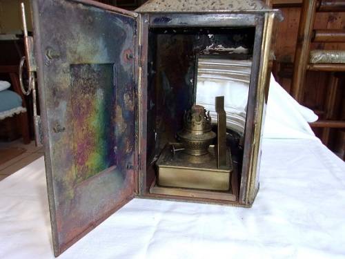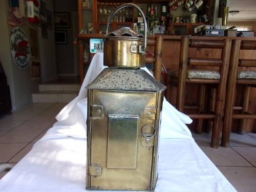 Large vintage ship lantern. I would estimate that this old lantern dates to the 1960s. It is made from copper coated metal, and has a clear glass. It has a door at the back, through which the fuel tank is accessed. It has a carrying handle. The lantern measures 39cm (h) x 25cm (w). It is in fair condition for its age - has wear to the plating and some surface rust. Great buy for your mancave.