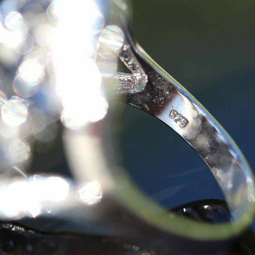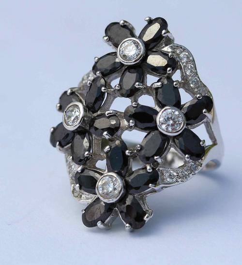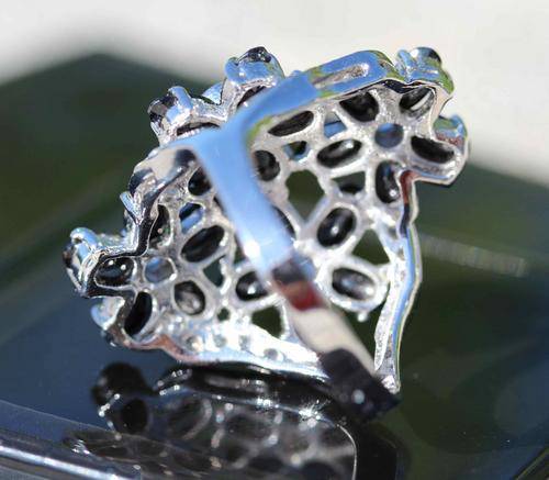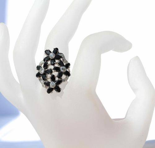 LARGE VINTAGE STERLING SILVER RING WITH BLACK & WHITE CRYSTALS IN LOVELY FLORAL DESIGN