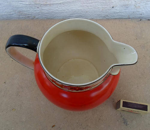 RATHER ATTRACTIVE VINTAGE CERAMIC JUG MADE BY WEDGWOOD AND DECORATED IN THE RICHELIEU PATTERN WITH HANDPAINTED CHERRY RED COLOUR AND BLACK PAINTED HANDLE. NICE CONTRAST WITH PATTERNED FREEZE AROUND THE TOP SECTION. VGC, NO CHIPS OR CRACKS AND NO REPAIRS. ONE TINY SPOT OF RED FLAKED OFF, EASY TO TOUCH UP.