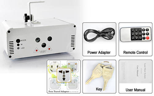 350mW Laser Show Projector with RGB (red, green, blue) lasers, cool multiple laser patterns, and the ability to sync the movements of the laser to music.