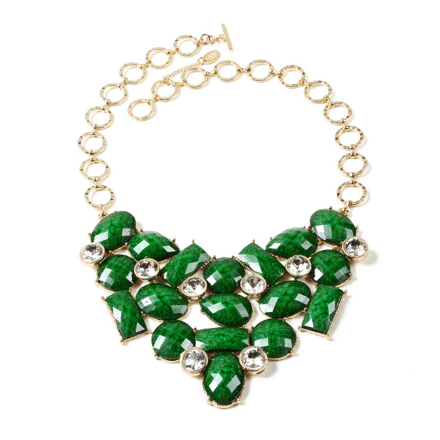 Leaf bib necklace with two tone resin stones. Measurements: Length 13"-15.5" adjustable; Bib: Length 6.5" x Width 1.25"; lobster closure. - Not suitable for water usage. Includes pouch.