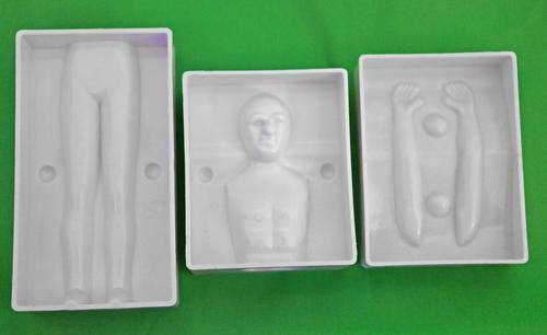 The Kit contains 4 models, each model has 3 sets (head and chest, legs, arms) and each set has two moulded pieces (e.g. head and chest is composed of two pieces, front and back). In total, the Mould Set contains 24 moulded pieces.