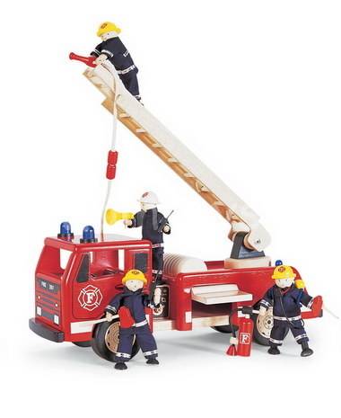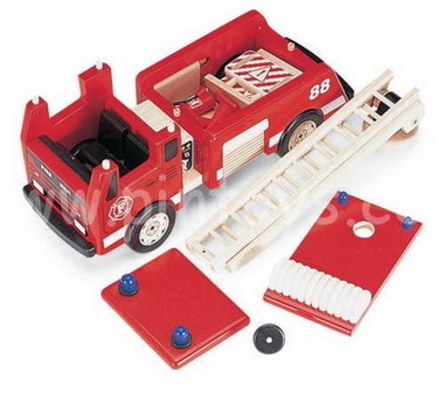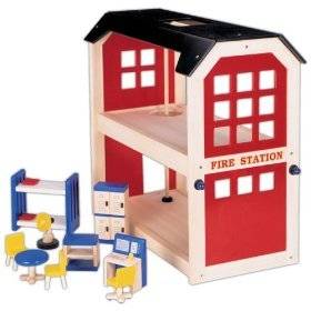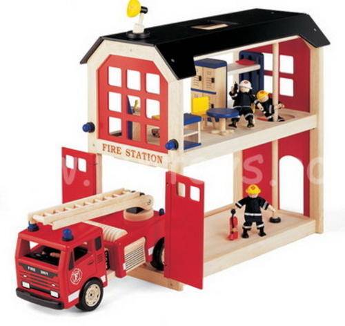 This beautiful fire station comes complete with all furniture as shown, four fire fighters and their equipment as shown, a siren red fire engine with removable lid and ladder, all fire hoses, warning signs and equipment.