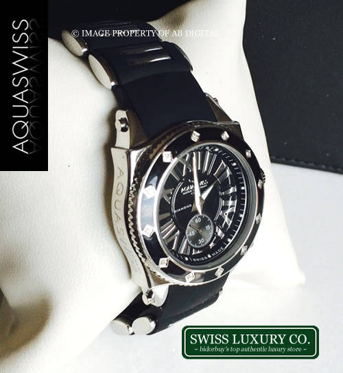 This is the highly recognised SWISSPORT DIAMOND model from AQUASWISS, this model comes with a flawless sapphire crystal, screw down back, unidirectional bezel, black rubber/plated 18ct steel bracelet, highly fluorescent markers, comes equipped with a screw down crown, a diving capacity of 330 feet (100 meters ), stainless steel construction, 12 genuine diamonds.