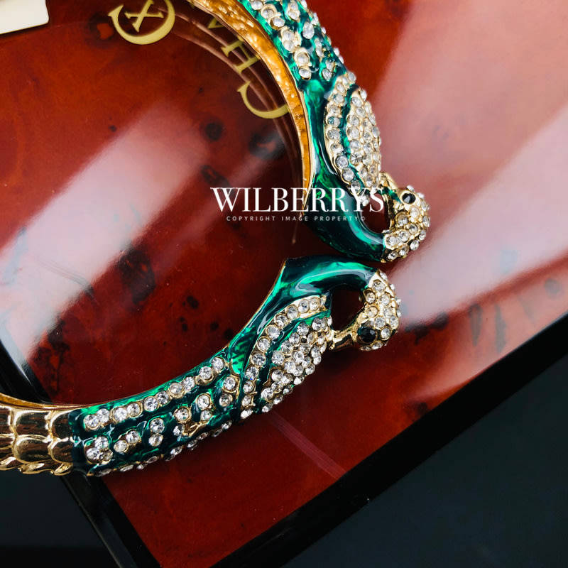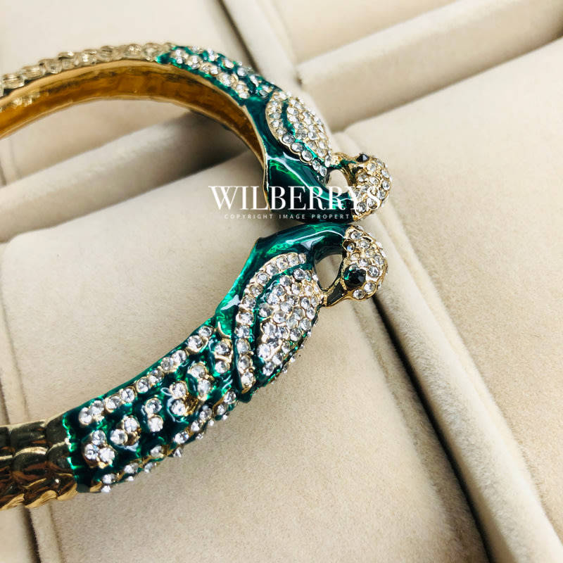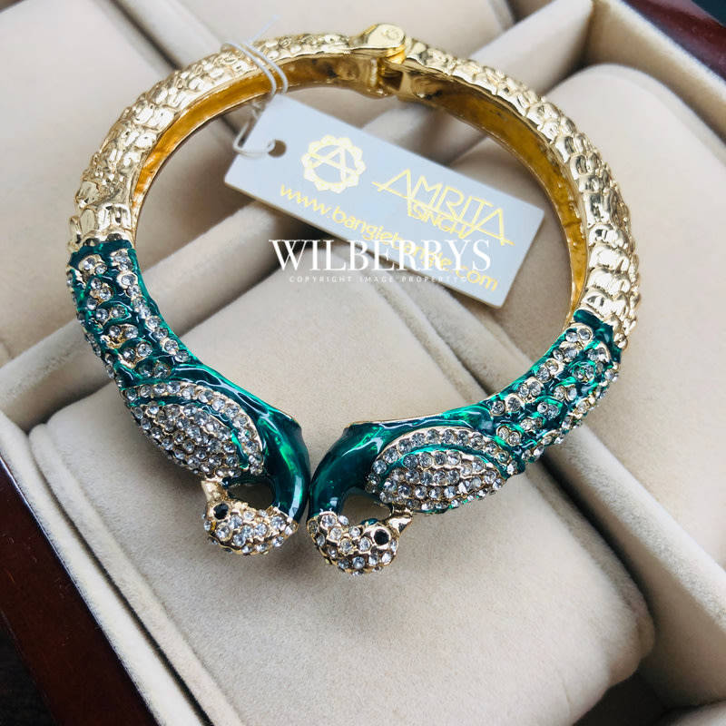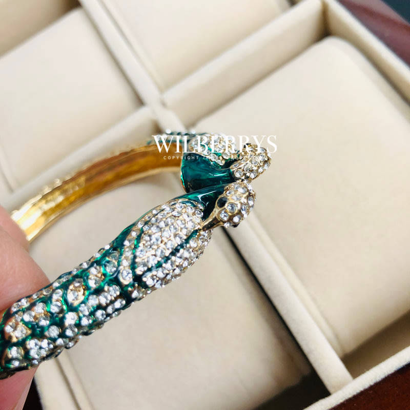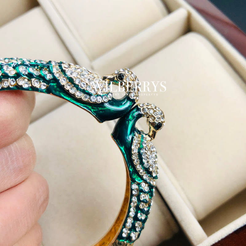 Two peacock heads covered in crystals create a stylish cuff. Hinge cuff with Austrian crystals. Measurements: Width 0.5"; Inner Diameter: 2.25" - Not suitable for use in water