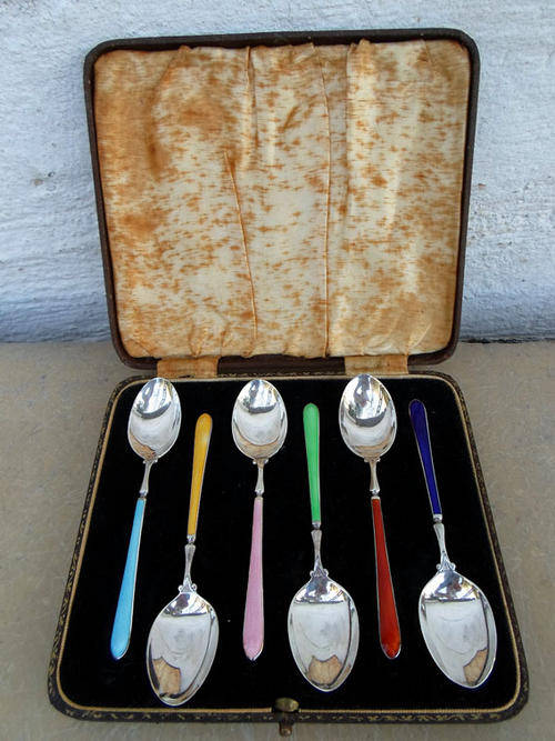 LATE ENTRY~BEAUTIFUL BOXED SET ART DECO STERLING SILVER HM ENAMEL TEA SPOONS~6 COLOURS~WOW!!!