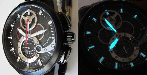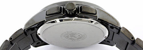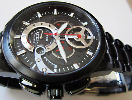 Applied luminescent polished silver-tone baton markers, Red Arabic numbers and white indices mark subdials, White indices form surrounding minute track, Analog date aperture between four and five o'clock, Black dial with textured guilloche pattern, polished screws and polished silver-tone gear wheel at twelve o'clock, Brushed black Ion-plated stainless steel bezel, Brushed/polished black Ion-plated stainless steel round case, Textured black Ion-plated steel crown, Polished black Ion-plated steel selector buttons, Stainless steel screw-down caseback, Mineral crystal, 100 meters/330 feet water resistant.