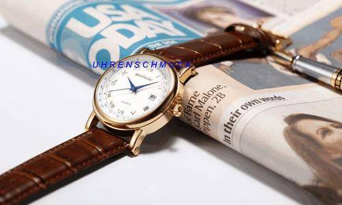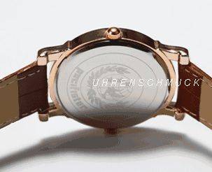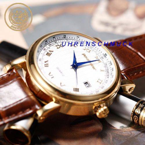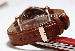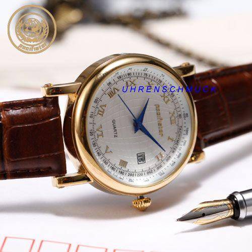 QUARTZ, ANTI SCRATCH GLASS,STAINLESS STEEL/GOLD CASE,WHITE DIAL, BLUE METALIC HANDS, GOLDEN ARABIC NUMERALS, STRAP LEATHER BROWN TOTAL LENGTH 240MM. BEZEL SIZE 40MM, CASE BACK LAZER ENGRAVED LOGO,