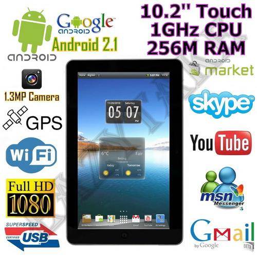 CPU Infortm X220 1GHz ARM11 Operating System: Google Android 2.1 Memory: 256MB Display Display: 1024x600 Resolution, 10”LCD Screen Storage: 2GB Net connect: RJ45 ENTER NET:10/100M WIFI WIRELESS NET:802.11 b/g USB 3G NET (ONLY SERTAIN STICKS) Language Multi-Language HDMI: 1080P Touch Games: Guerrilla (iguerilla) similar to the CS, Assassins Creed (Assasin`s creed) Auto rotating screen: 3 direction Camera: Yes,1.3M pixtel
