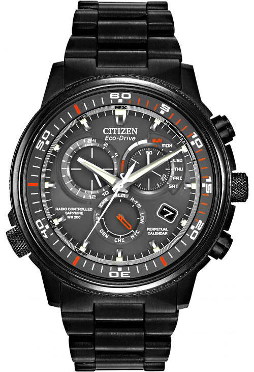 Sleek, stylish and stealthy, the Nighthawk A-T is the newest addition to the Citizen Eco-Drive atomic timekeeping collection. Radio-controlled in 5 time zones, this perpetual calendar chronograph with alarm also features an anti-reflective sapphire crystal, date and is WR200. In stainless steel with black carbon coated and with a grey dial and orange and white accents.