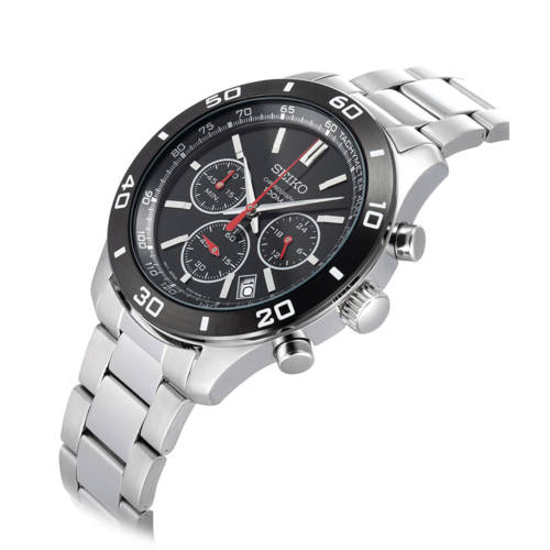 Black Dial with Silver Hands. Red Stopwatch Hand with Silver Stick Markers.