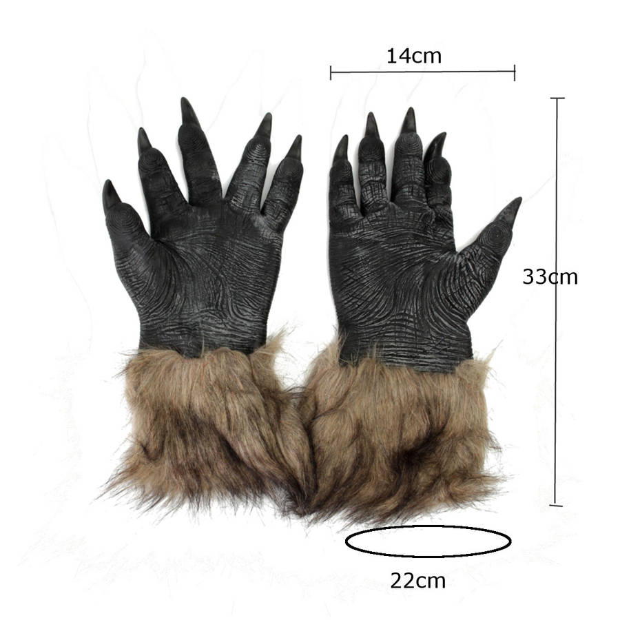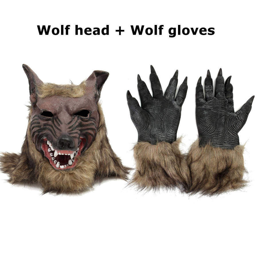 Latex Rubber Wolf Head Hair Mask Werewolf Gloves Party Scary Halloween Cosplay