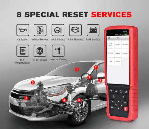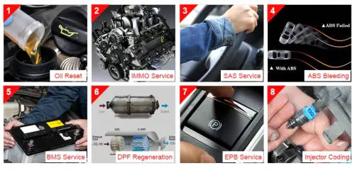 8 Special Reset Service: Equipped with 8 reset function(Oil Reset/EPB/BMS/SAS/DPF Regen/IMMO/ABS Bleeding/Injector coding), covering most common malfunction diagnostic on most 12V gasoline/diesel vehicle models.