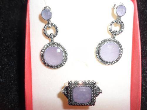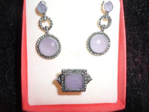 Absolutely fabulous set of Lavender Jade earings with matching ring set in solid silver surrounded with Marcasite. These beautiful and rare stones are a real find. An ideal and unique Christmass gift.