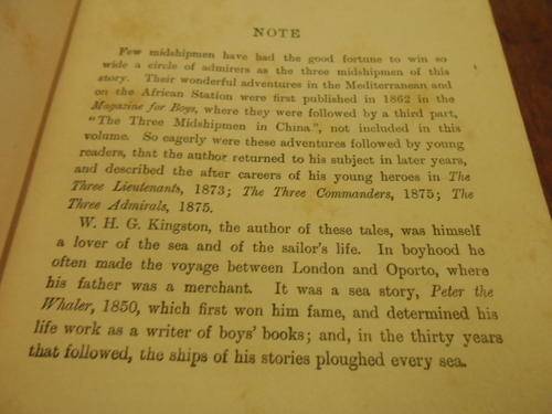 2. THE THREE MIDSHIPMEN - Their adventures in the Levant and in African Waters. A thrilling naval story for boys with few coloured plates. Blackies library of famous books illustrated blue Hardback, well-binded, inscription on first free end paper. Wear and tears to dustjacket, 272 pages, see pictures beneath.