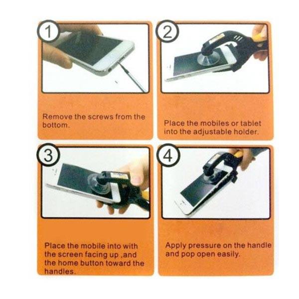 Features: Ergonomically designed handle with slip-resistant textured grip for comfortable hold. Adjustable tablet holder to suit different sizes of tablets and mobiles. Multi-angle PVC suction cup, easier to take apart every gadget you want. With two screen protectors to protect your phone from scratching during the disassembling.