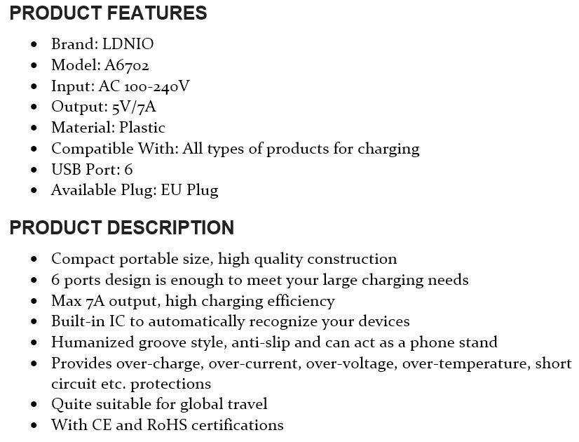 LDNIO Compact and Portable 6 USB Fast Charger for IOS and Android