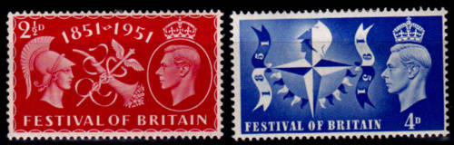 ENGLAND, 3 May 1951. British Anniversary Exhibition. Full set, mint, previously hinged. Hinge remains on back. View scans for condition as it form part of the description, CV +/-R 15.00. Note, display card not included, and the line across the images is due to the display card that we use to scan items.