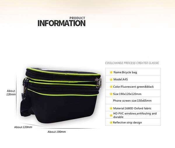 Specification: Brand name: LEADBIKE Color: Black&fluorescent green Size: 190x120x120mm Phone pack size: 150x65mm Material: 1680D oxford fabric Suitable for: Riding and other outdoor sports