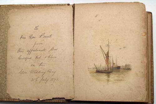 A large (290mm x 230mm x 60mm) leather-bound photo album presented to a couple by their sons on their silver wedding anniversary in 1892. It features large frames, some of which have surrounding pictures of England's major rivers.