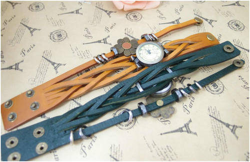 LEATHER BRAIDED STRAP - VINTAGE FLOWER - WRAP QUARTZ WRIST BRACELET WATCH - DEEP GREEN