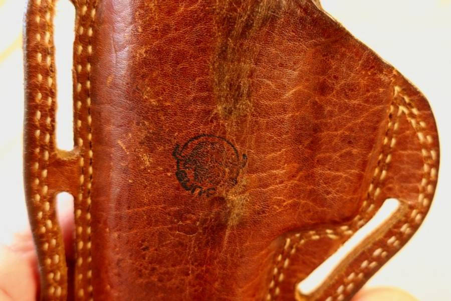 Leather holster. There is an S on the holster below a buffalo stamped into the leather. The wording under appears to be Sun - P......... This is a used leather product but in nice condition. The Stitching is in good condition.