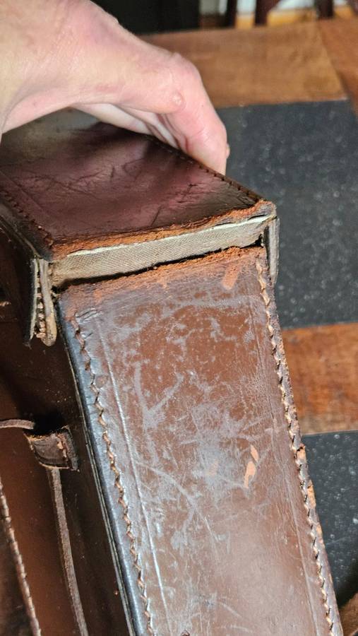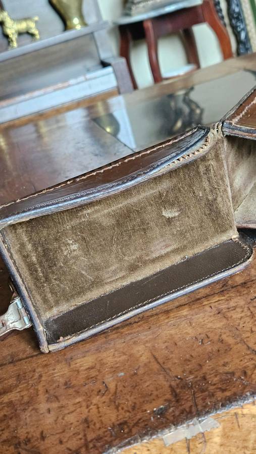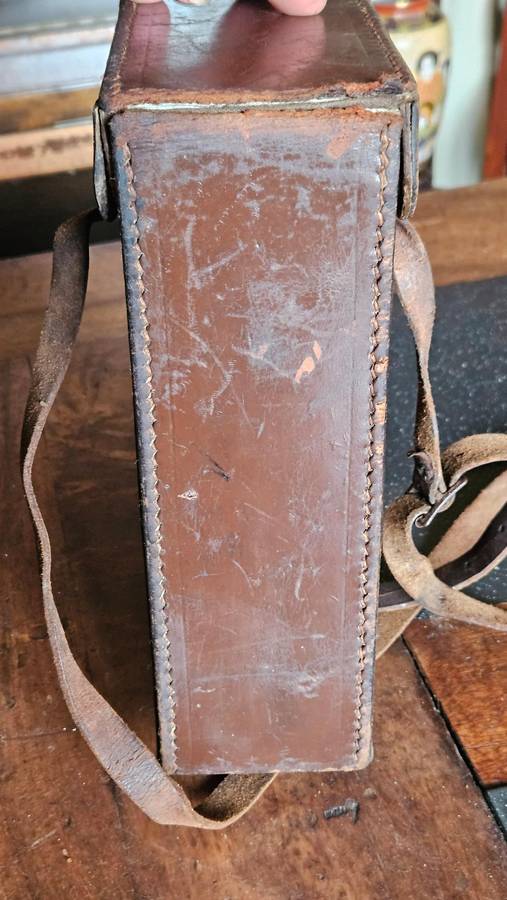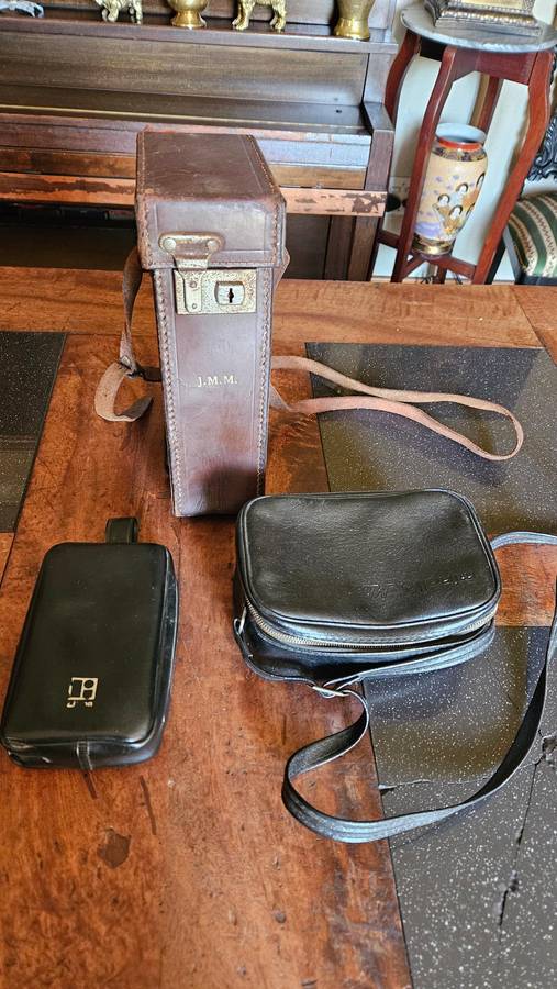 The two black carry bags are in a good usable condition. The leather pouch is in a good usable condition except for the leather on the lid that is torn but still attached. The latch has some rust appearing on the surface.