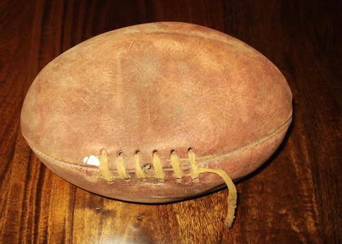 Old leather rugby ball in played condition.