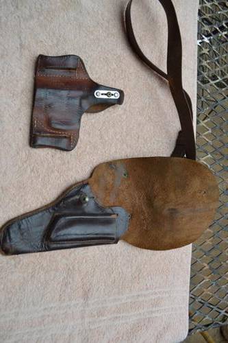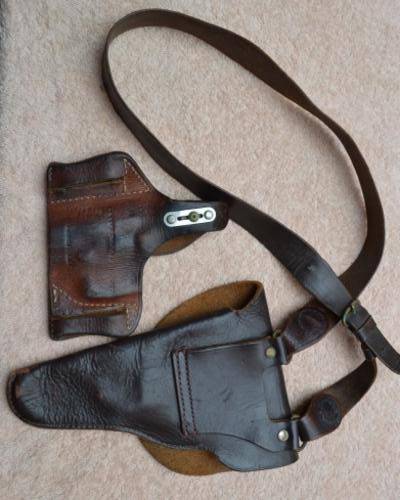 Leather Service Pistol Holster & Hip Pistol Holster Service Pistol Holster with magazine holder both in good condition length of Service pistol holster with strap - 74cmholster size - 24,3cm x 17cmhip holster size - 16,5cm x 14,8cm
