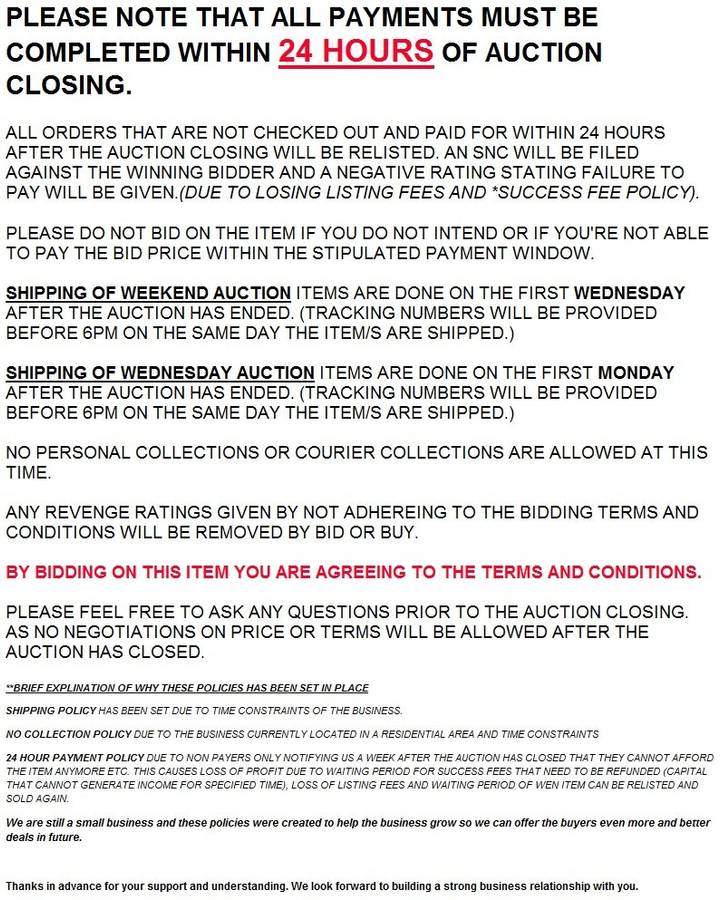 Please be advised that we as the seller will not be held liable for any loss due to theft or damage of the item while in transit. Therefore it is advised to take out insurance on all orders. Insurance is charged at 3% of winning bid.