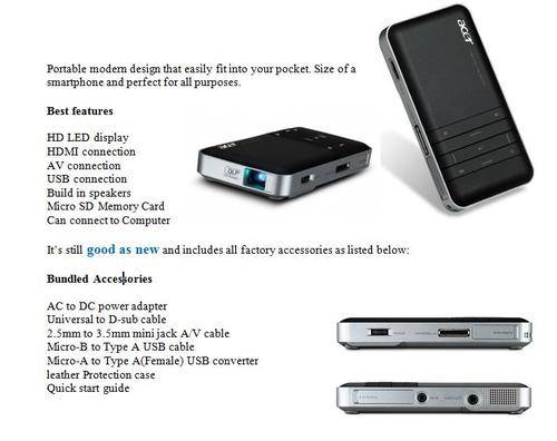 LED HD Acer Projector with HDMI ,USB ,AVI ,USB ,Micro sd ,built in speaker ,rechargable battery