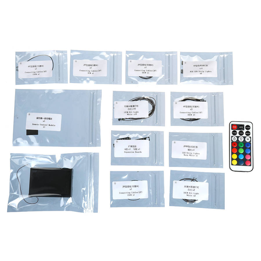 Remote Version White 1 x 6-port Expansion Board 1 x 12-port Expansion Board 1 x Battery Box 2 x 30CM Bit Light(White) 10 x 15CM Bit Light(White) 1 x (2P)LED Strip Light(Warm White) 4 x (4P)LED Strip Light(RGB) 1 x 5CM (2P)Connecting Cable 1 x 15CM (2P)Connecting Cable 1 x 50CM (2P)Connecting Cable 1 x 15CM (4P)Connecting Cable 3 x 30CM (4P)Connecting Cable 1 x Remote&Module