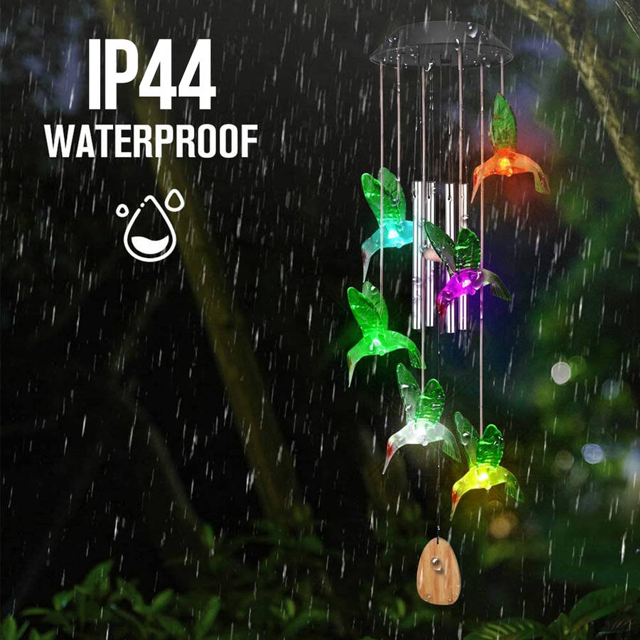 Waterproof DesignWaterproof rate: IP55. Rain and moisture. Eligible and durable plastic products, no fade, no shape change, no fear of Ice and cold. Hanging solar powered wind chimes outdoor, decorating your patio, garden, lawn etc. it`s also a great gift for mom, girlfriend.