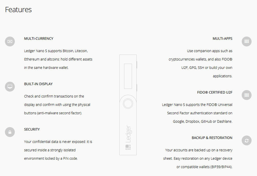 Ledger Nano S is a Bitcoin, Ethereum and Altcoins hardware wallet, based on robust safety features for storing cryptographic assets and securing digital payments. It connects to any computer (USB) and embeds a secure OLED display to double-check and confirm each transaction with a single tap on its side buttons. Supported Currencies |