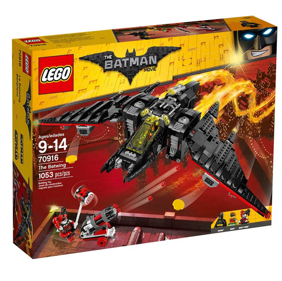 Fly high above Gotham City in the Batwing and battle against Harley Quinn with Batman and Robin in this cool THE LEGO® BATMAN MOVIE: The Batwing set. The Batwing features an opening dual minifigure cockpit for Batman and Robin, rotating boosters, adjustable wings for flight and landing modes, 2 spring-loaded shooters, 2 disc shooters and an opening rear compartment with a car inside. Harley Quinn has a mobile cannon with a 6-stud rapid shooter. Includes 3 minifigures with weapons and accessory elements including Batmans Batarang and Harleys hammer.