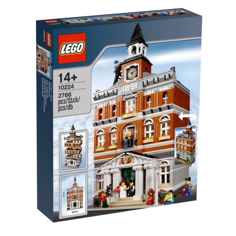 This classic three-storey town hall building is the latest addition to the LEGO Modular Buildings series. This highly-detailed model features large entrance-way columns and coat of arms, a tall bell tower with clock and a large skylight giving a view inside the building. On the ground floor, the large hall, tax office and auditorium are perfect for servicing the town's citizens. Take the working elevator up to the secretary and mayor's offices on the second floor, furnished eloquently with desks, chairs, paintings and even a frog sculpture. There's even a balcony for addressing the town's citizens. On the third floor, a spacious meeting room features a large conference table, chairs, globe and plants. Includes 8 minifigures: mayor, secretary, bride and groom, press woman, janitor and 2 children