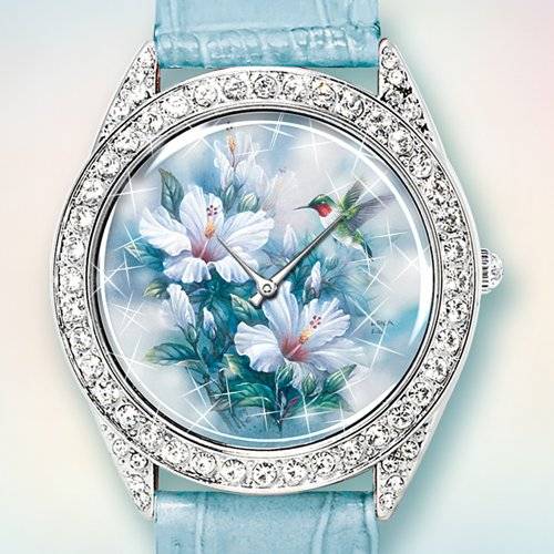 Invoking the tranquility of nature and nature's crown jewels; the hummingbird takes flight in this stunning Lena Liu artistic watch designed by award-winning artist Lena Liu to showcase one of her original paintings. The watch face of this handcrafted timepiece radiates with the color and romantic grace of a hummingbird garden and is surrounded by a sparkling bezel of Swarovski crystals in a pave setting. Another glittering Swarovski crystal adorns the crown.This Lena Liu wearable art is a fine jewelry exclusive from The Bradford Exchange with accurate quartz movement. The leather straps adjust to fit most wrists and beautifully coordinate with the color of the art. The custom-designed case makes the perfect finishing touch. Lena Liu art is highly sought; strong demand is expected. Order now! Adjustable leather strap in sky blue matches the exquisite artwork adorning the watch face A beautiful addition to any woman's jewelry wardrobe Watch movement is protected against defects with a full-year limited warrantyArrives with a custom-designed presentation case perfect for safekeeping or gift givingCertificate of AuthenticityWatch face measures approximately 1-3/8" in diameter; 3.5 cm in diameter; adjustable; leather strap fits most wrists