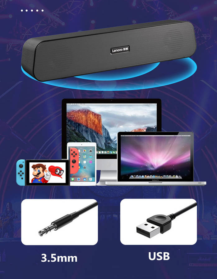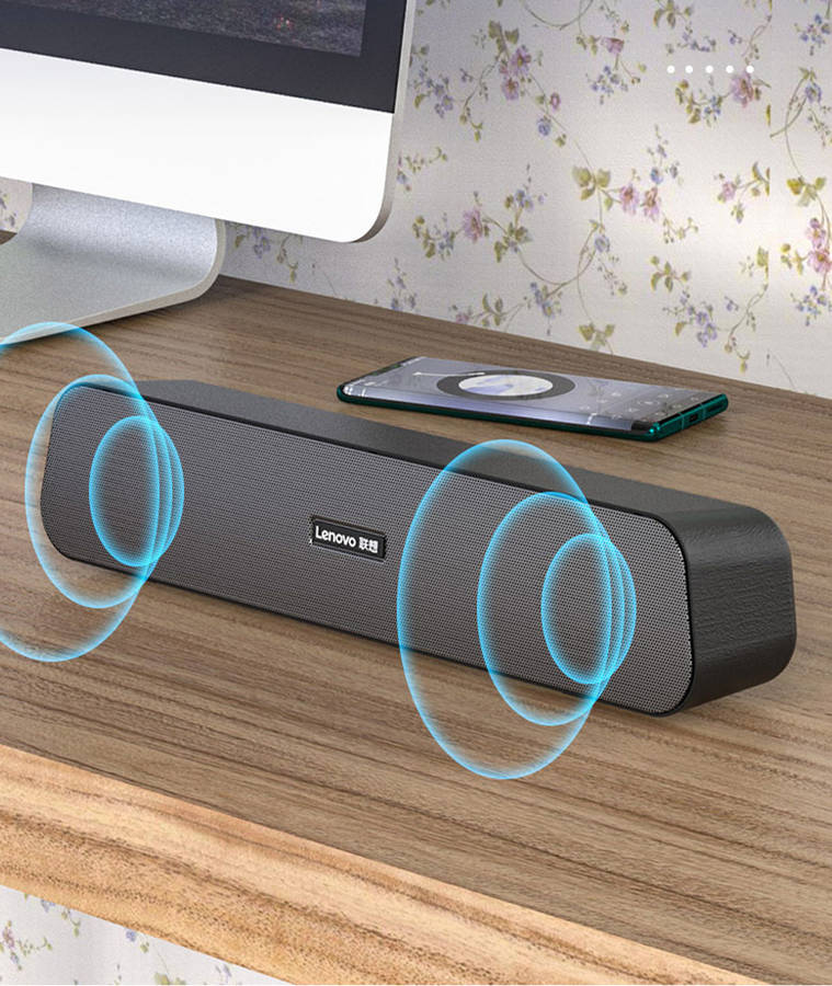 Specifications: Brand: Lenovo? Model: BMS09? Voltage: 5V DC, 2A Channel: 2.0 sound system Horn diameter: 52mm*2 SNR: a???60dB Frequency response: 90HZ-20khz Connection mode: 3.5mm, USB Sensitivity: 550mV Play format:MP3 Color: Gray Size: 335*60*70mm