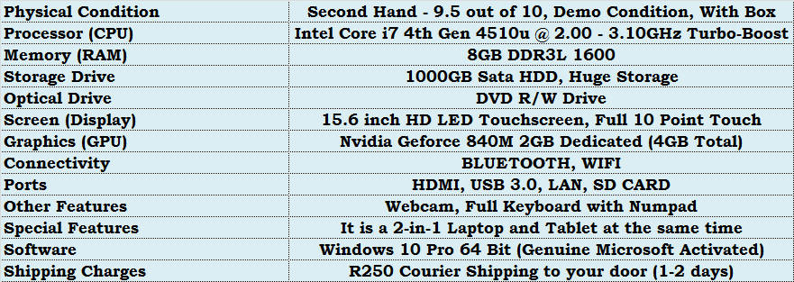 Lenovo Flex 2 15.6inch 2-in-1 Tablet-Notebook, Core i7 4th Gen, 1000GB, 8GB Ram, Nvidia 2GB, Win 10